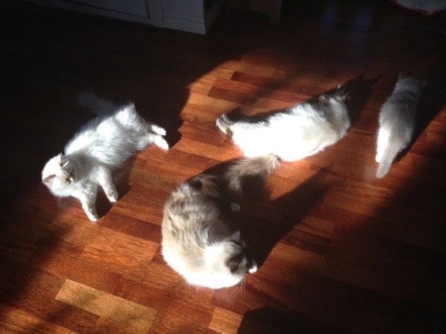 Här går vi i väntans tider, Iriz och Sussi håller en på sträckbänken. Jag har förberett allt som kan tänkas förberedas, men dom går mest och vankar eller äter eller sover, för inte föder dom några kattungar! Och nu är dom så runda att dom ser sprickfärdiga ut. Jag ställer klockan mitt inatten för deras skull, men när jag vinglar omkring och letar efter dom, så plirar dom mest åt mej, och somnar om.